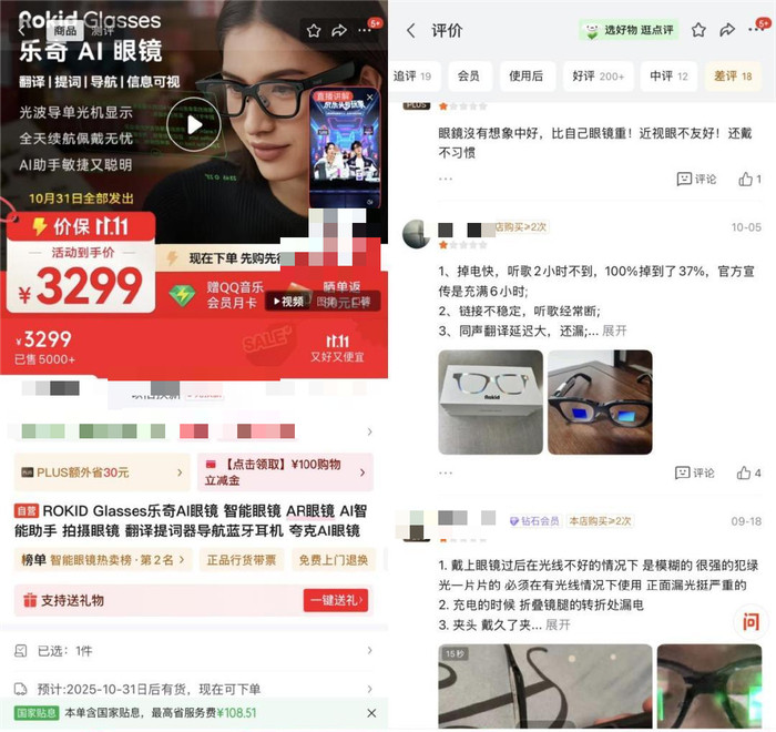 记者在电商平台中注意到,部分给出差评集中在续航短、边缘显示不清晰声音延迟、镜片不平佩戴不舒适等智能眼镜一系列功能性不足。